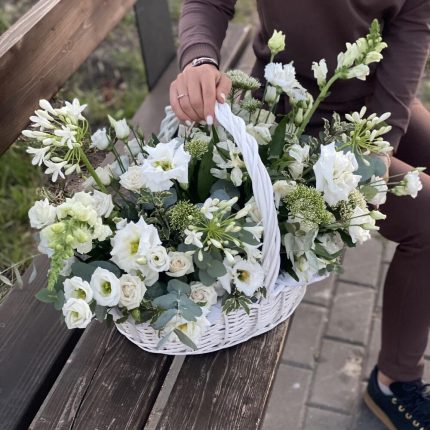 Корзина Ренессанс из эустомы, трахелиума, альстромерии, роз, антирриума и агапантуса