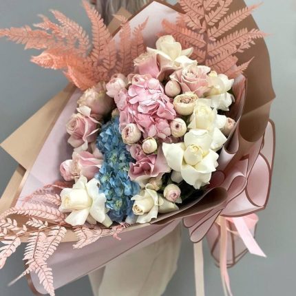 Авторский букет с розами Мента, пионовидными кустовыми розами, маттиолой и эустомой