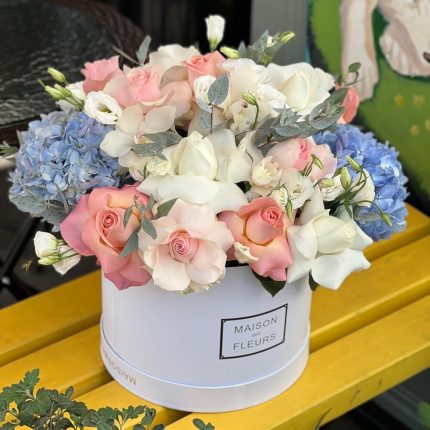 Цветы в коробке с гортензией,пион розами,матиолой,альстромерией,эустомой,колосьями пшеницы и эвкалиптом