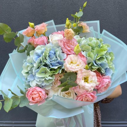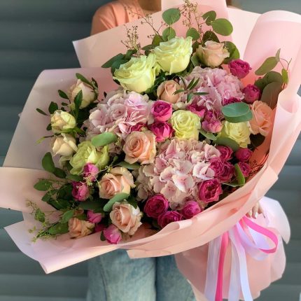 Большой букет с французскими розами, пион кустовой розой и гортензией
