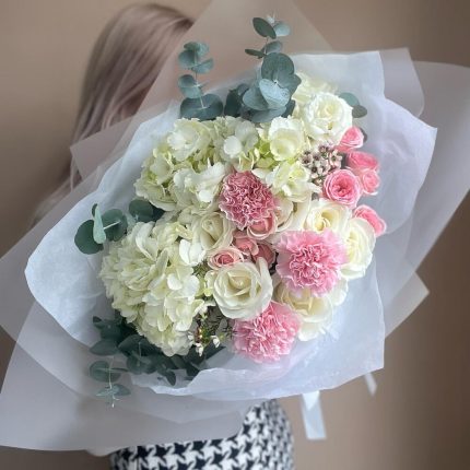 Сборный букет из кустовых роз, хризантем, роз, сорго, гипсофилы, гвоздик