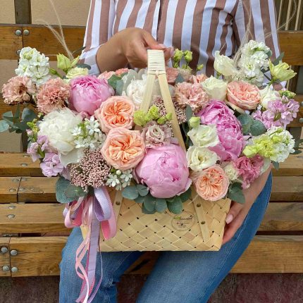 Бархатный цилиндр из голубых диантусов, розовых пионов и ароматной маттиолы