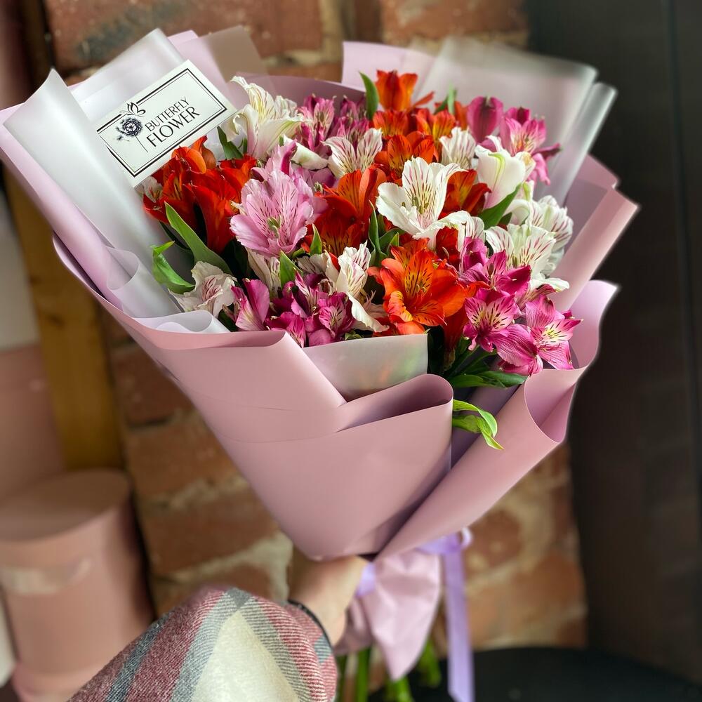Букет из 11 разноцветных альстромерий в стильной упаковке “Салют”
