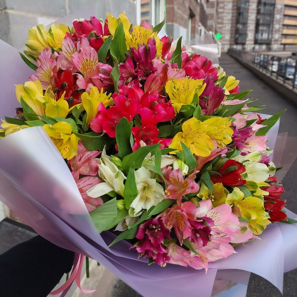 Альстромерия Микс Европа – 35 шт.Упаковка дизайнерская – 2 шт.Лента атласная – 2 шт.