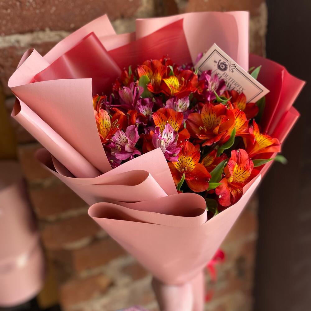Букет из 7 альстромерий в дизайнерской упаковке “Всполохи огня”