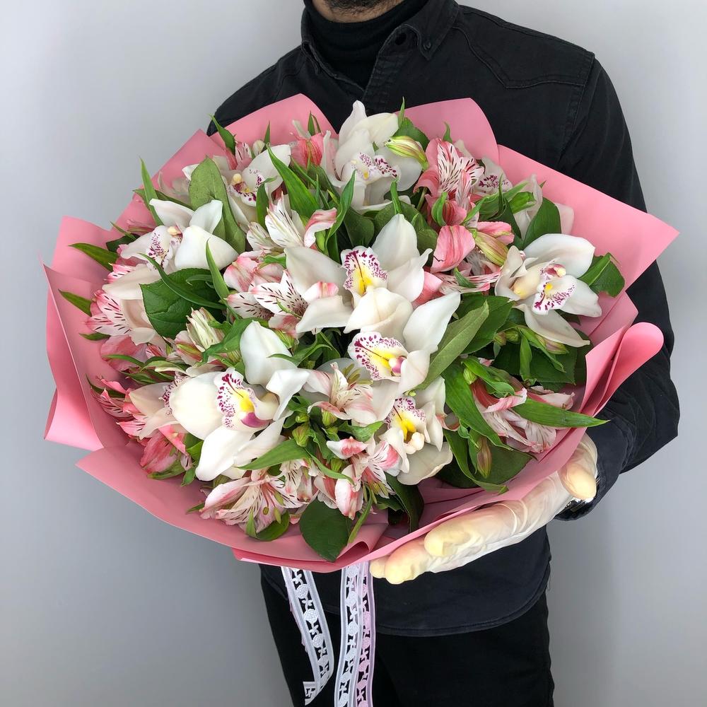 Орхидея Цимбидиум – 15 шт.Альстромерия – 16 шт.Упаковка – 1 шт.зелень декоративная – 15 шт.