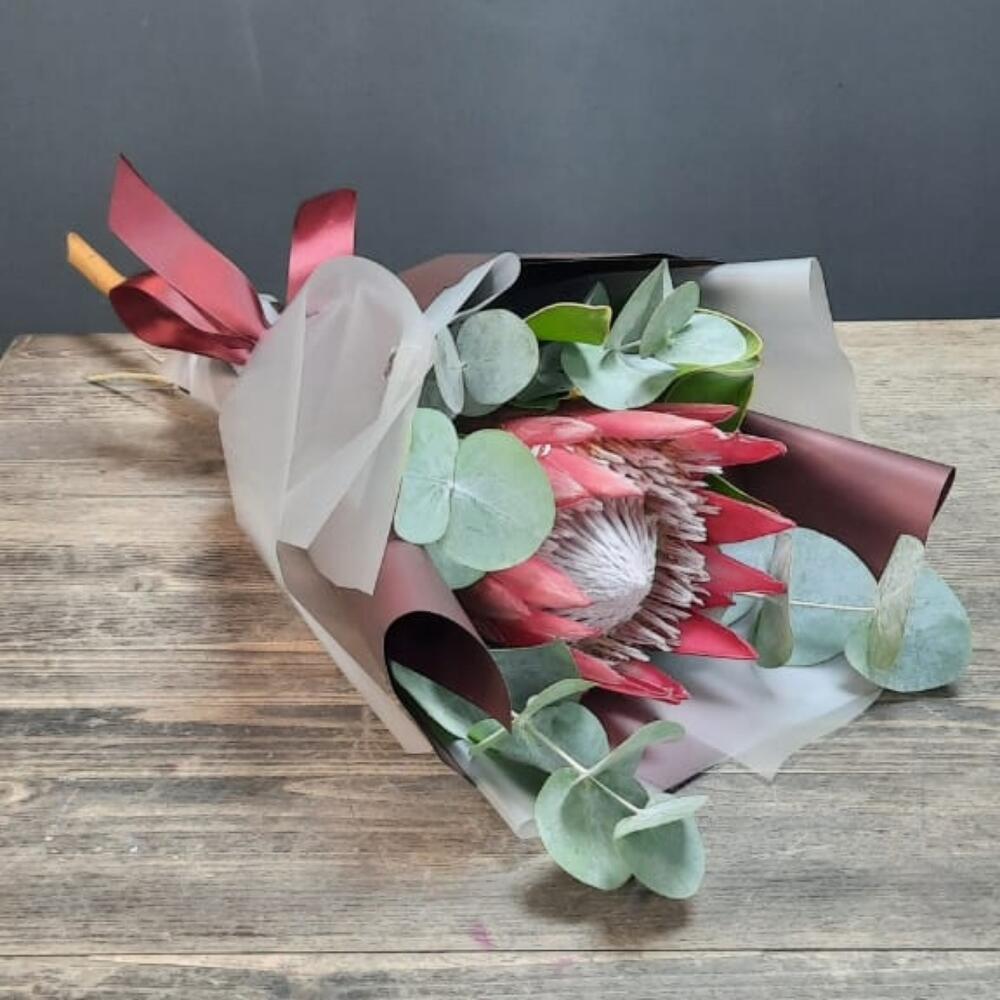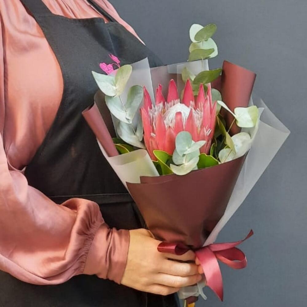 Протея – 1 шт.Эвкалипт – 1 шт.Лента атласная – 1 шт.Упаковка дизайнерская – 2 шт.