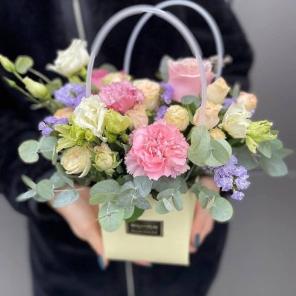 Лента – 1 шт. Тишью – 1 шт. Шляпная коробка – 1 шт. Флористический оазис – 1 шт.