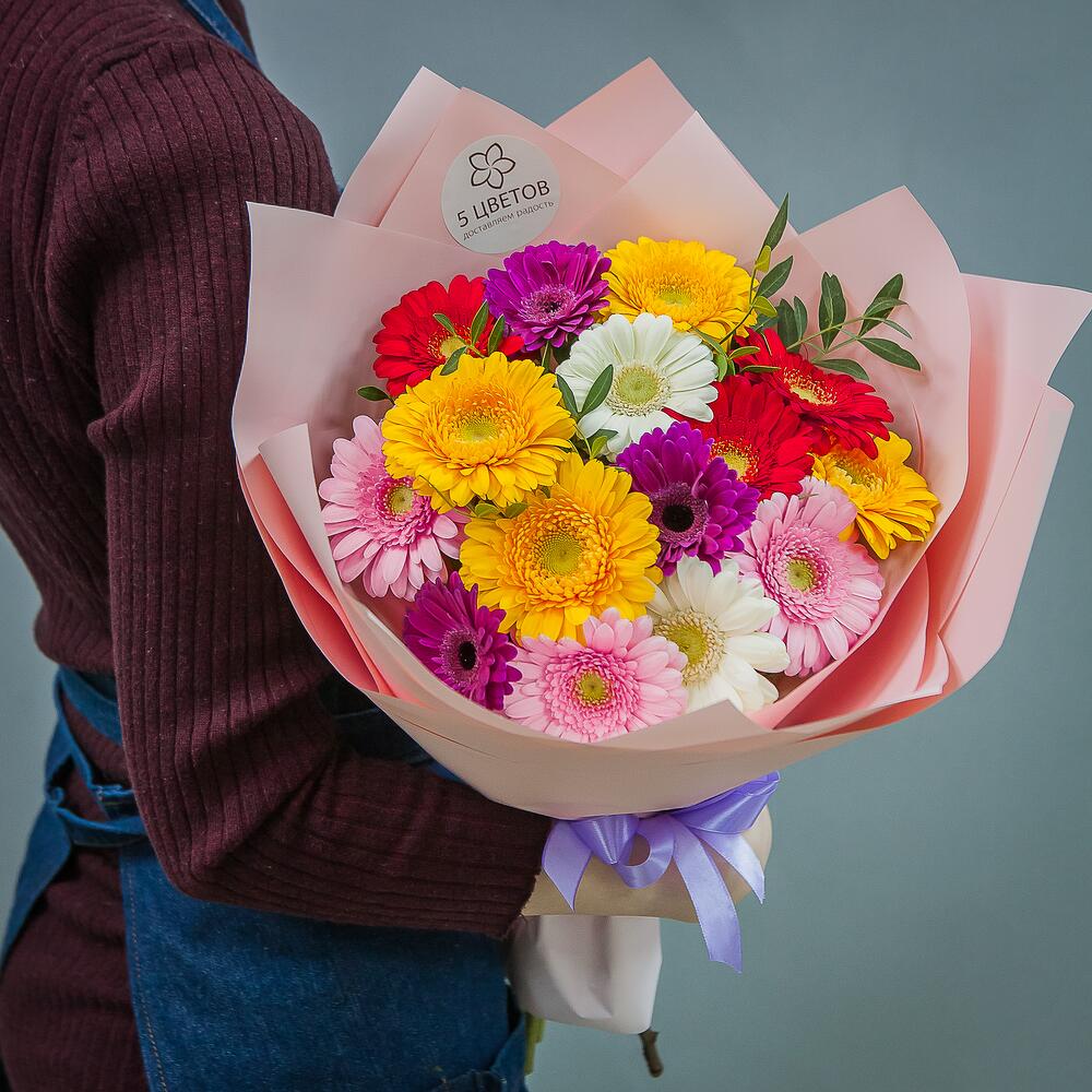 Гербера белая – 3 шт.Гербера желтая – 3 шт.Гербера розовая – 5 шт.Гербера красная – 4 шт.