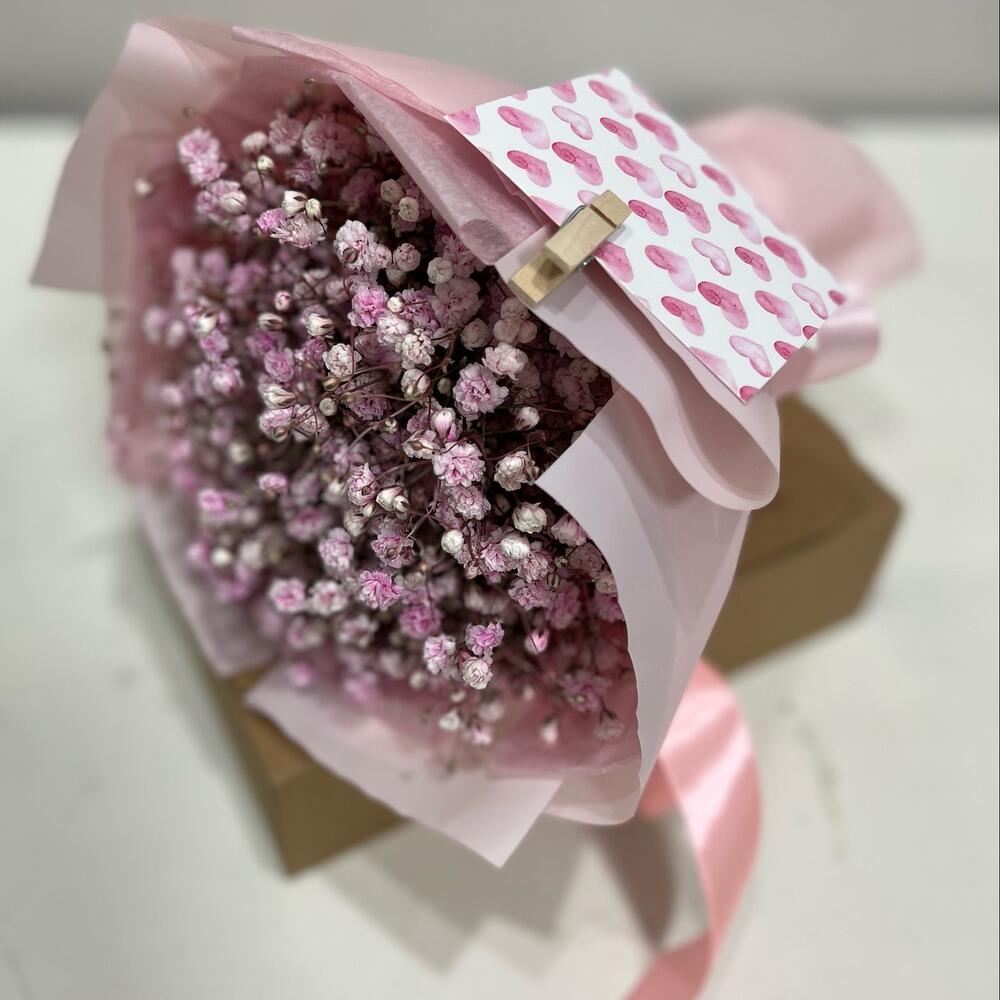букетик из розовой гипслфилы – 1 шт.Дизайнерская упаковка – 1 шт.тематическая открытка – 1 шт.крафтовая коробка – 1 шт.Эклер – 2 шт.Макарон – 6 шт.