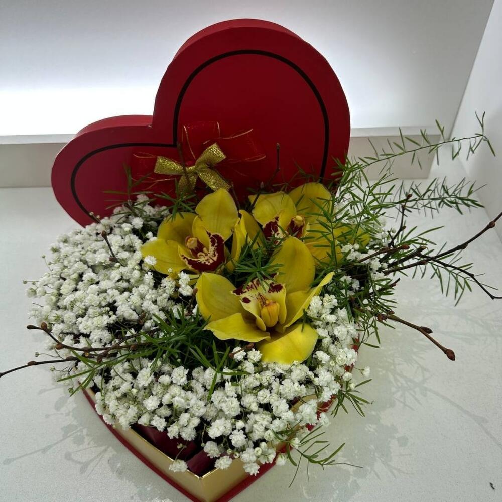“Сладкое сердце ” – цветочная композиция с сладостями в коробке “Сердце”