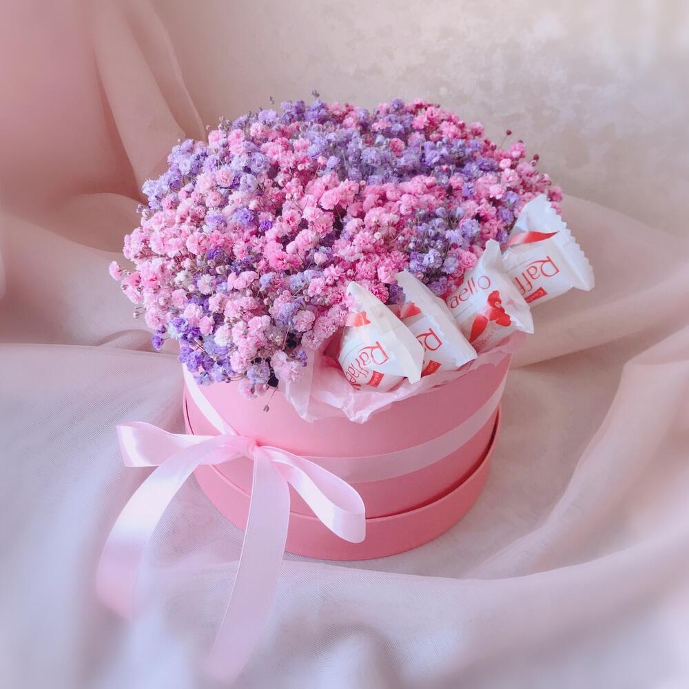 Конфеты Raffaello – 4 шт.Шляпная коробка с лентой – 1 шт.Флористическая губка – 1 шт.гипсофила радужная – 5 шт.