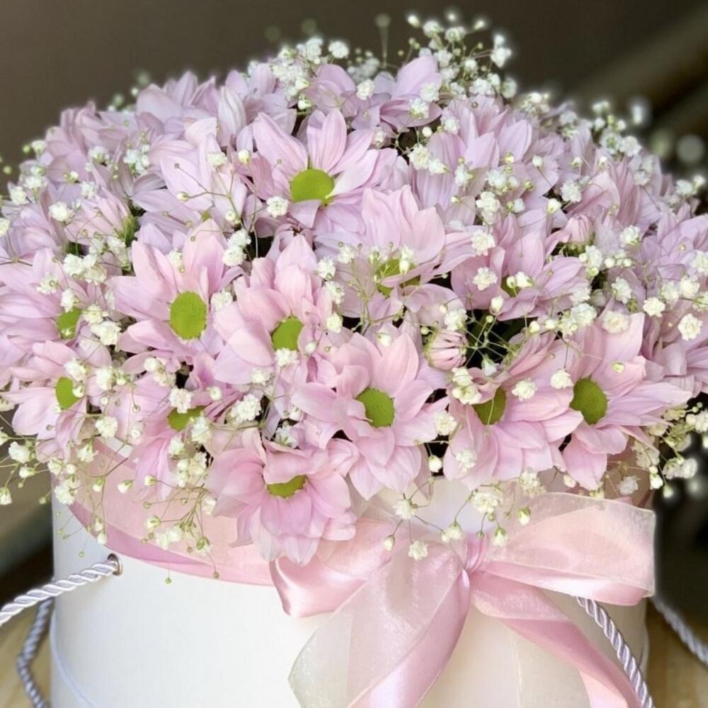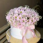 “Сиреневый туман” – композиция из гипсофилы в шляпной коробке