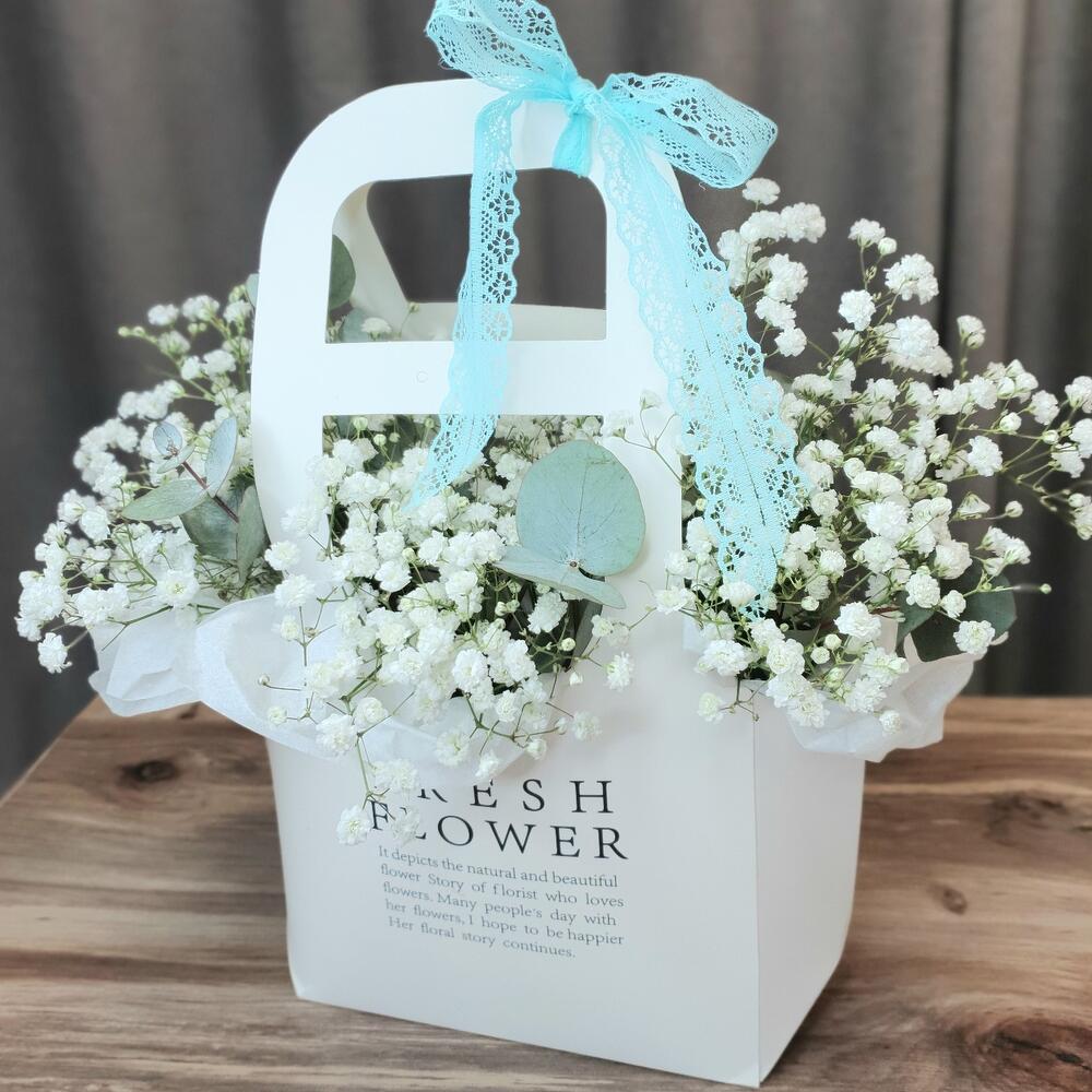 Воздушное облако белоснежной гибсофилы с ароматным эвкалиптом в стильной сумочке)))