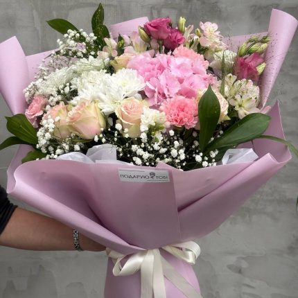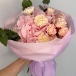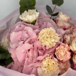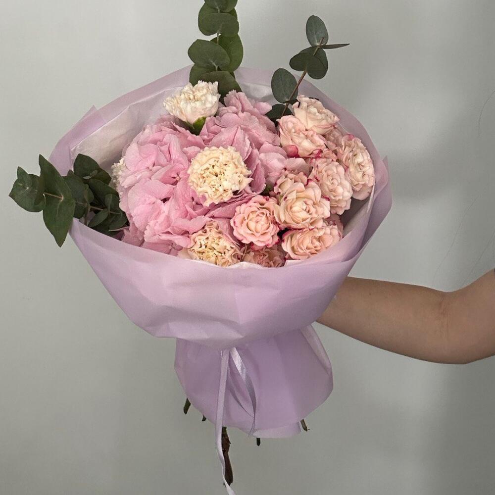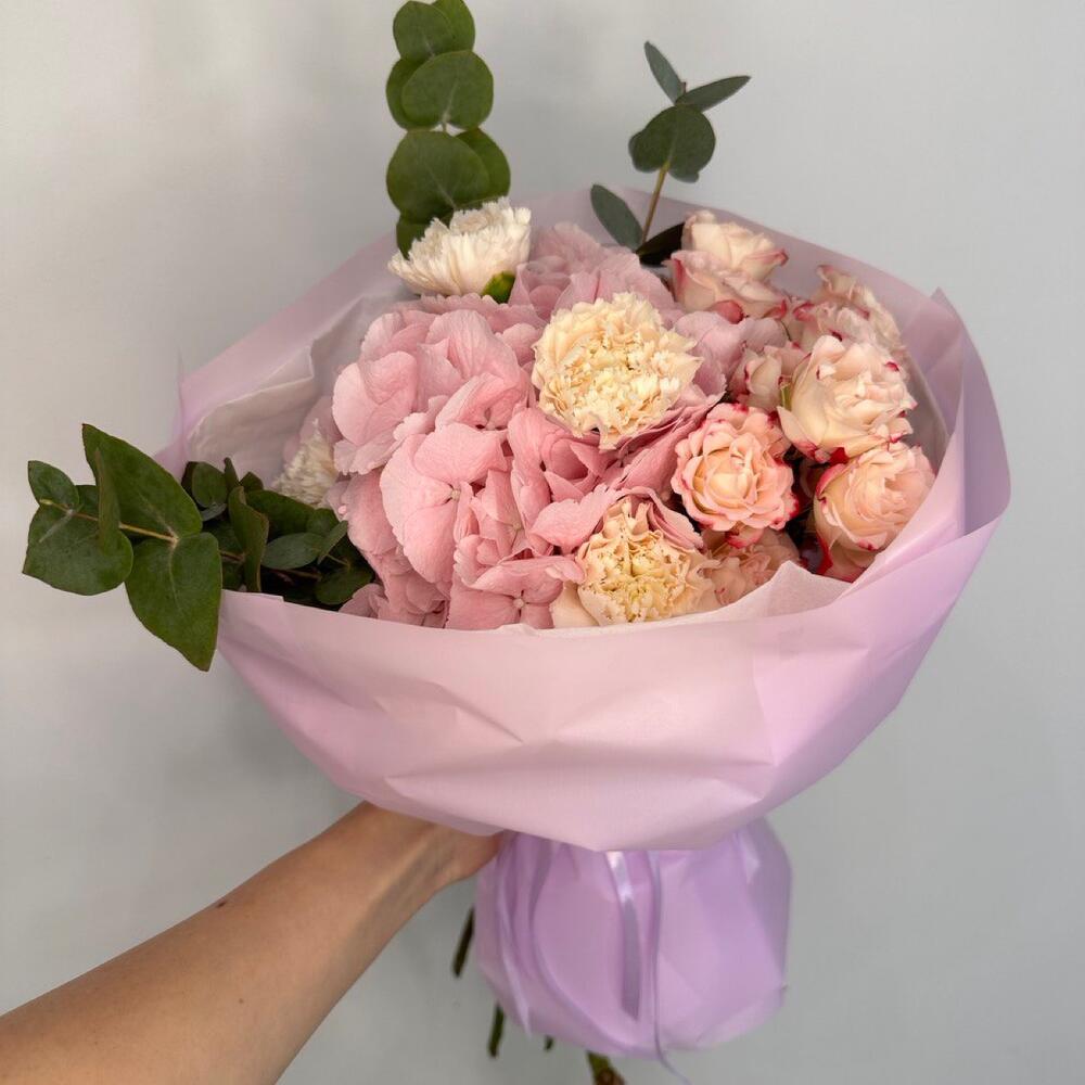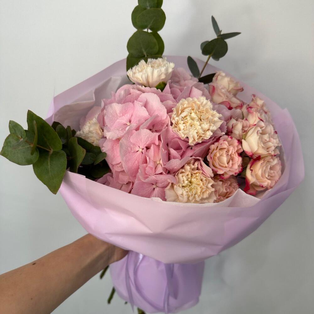 Букет из гортензий, диантусов, кустовых роз,эвкалипта