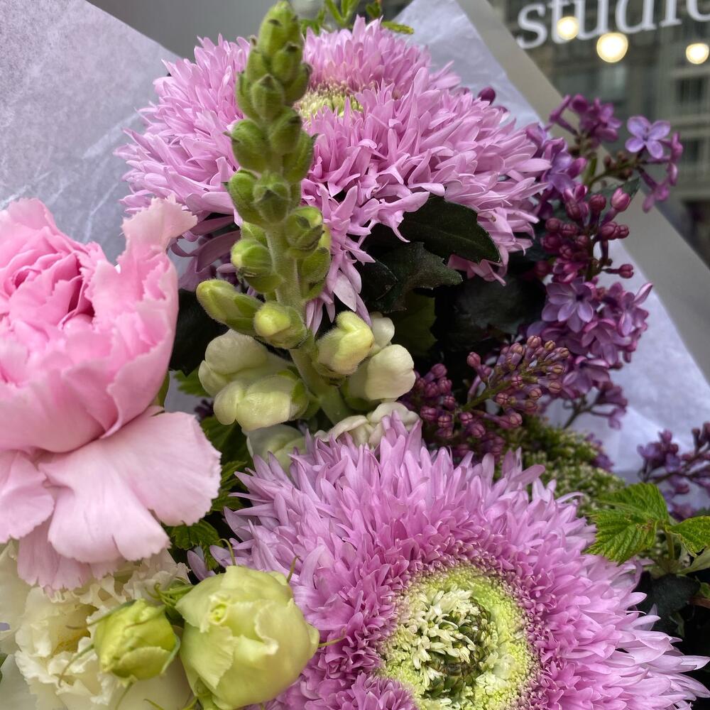 Хризантема одноголовая – 3 шт.Диантус сортовой – 3 шт.Альстромерия – 2 шт.матрикарья – 2 шт.антиринум белый – 2 шт.Сирень – 2 шт.эустома белая алиса – 2 шт.ветви малины – 3 шт.Упаковка дизайнерская – 4 шт.Лента атласная – 1 шт.