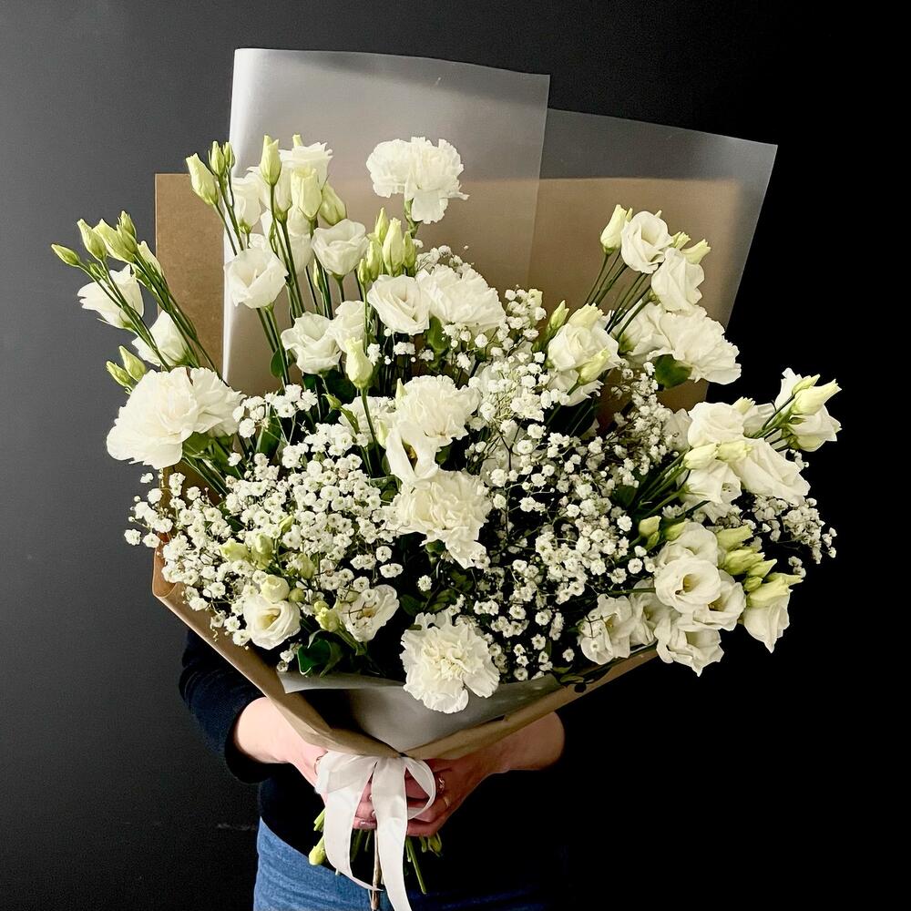 Гипсофила – 3 шт.Диантус – 7 шт.Фисташка – 3 шт.Крафт – 3 шт.эустома белая – 5 шт.
