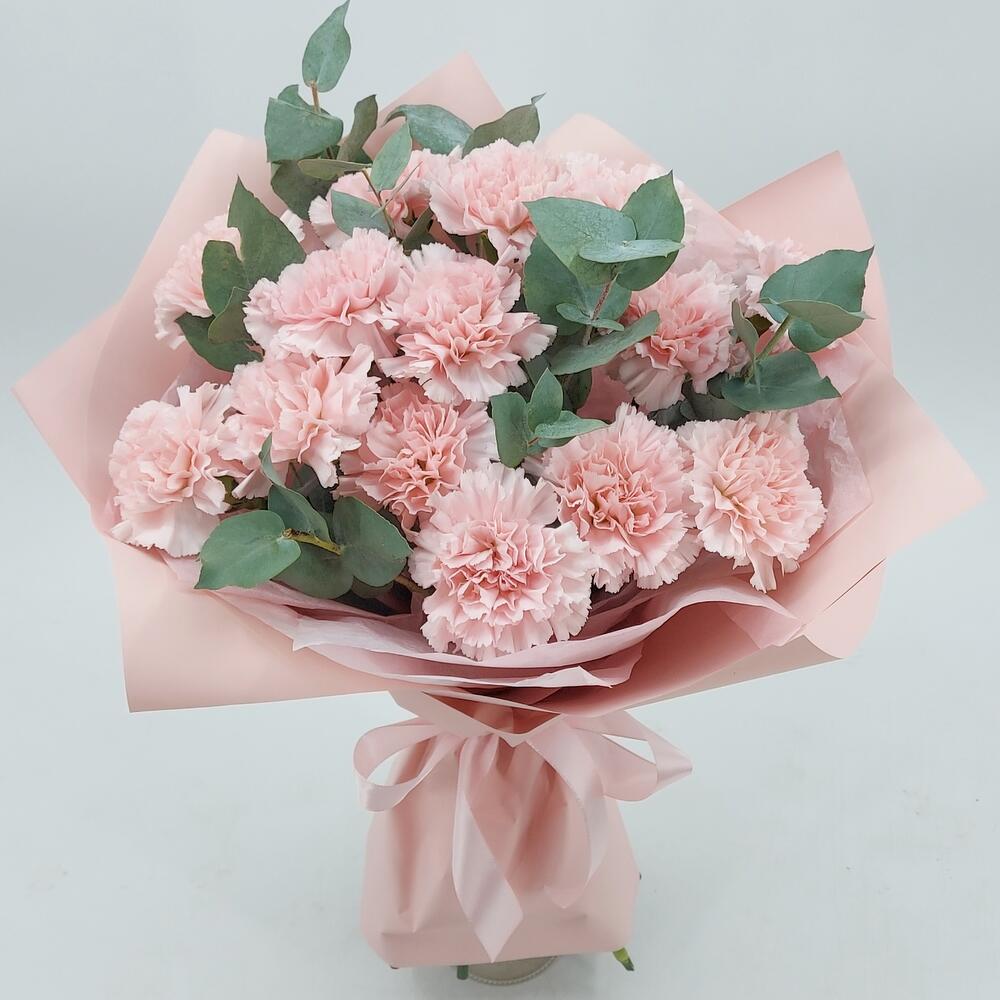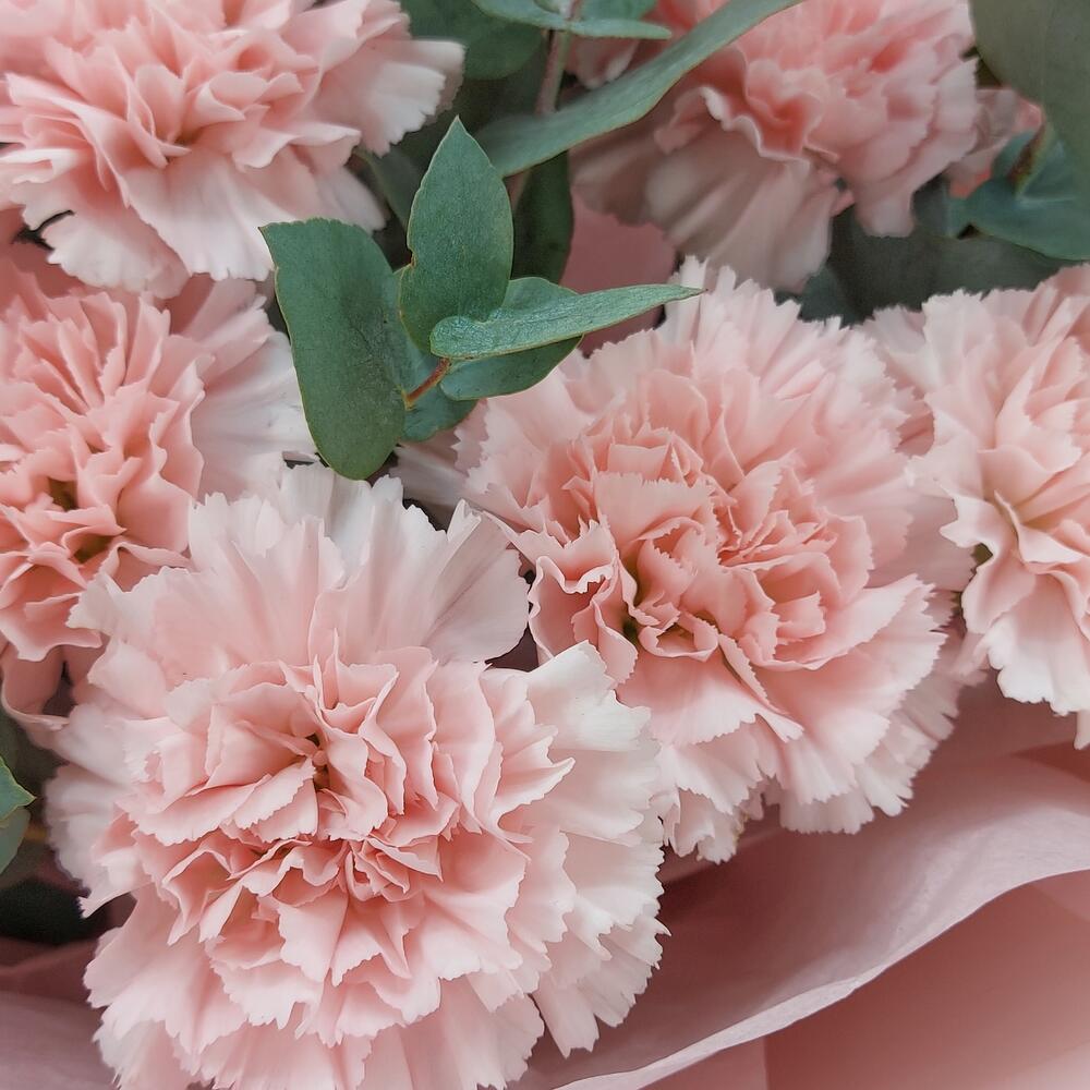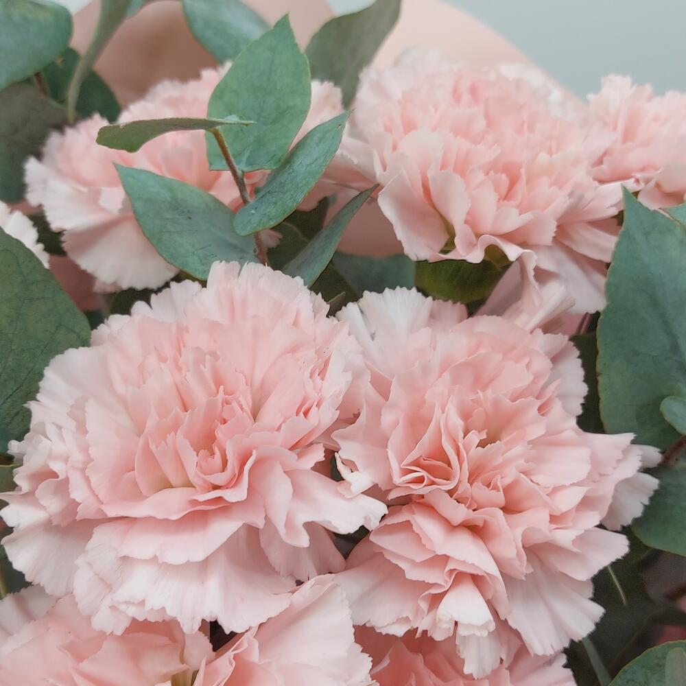 Стильный, ароматный и очень стойкий букет из розовых гвоздик с эвкалиптом. Такой букет всегда уместен и подойдёт для любого повода.