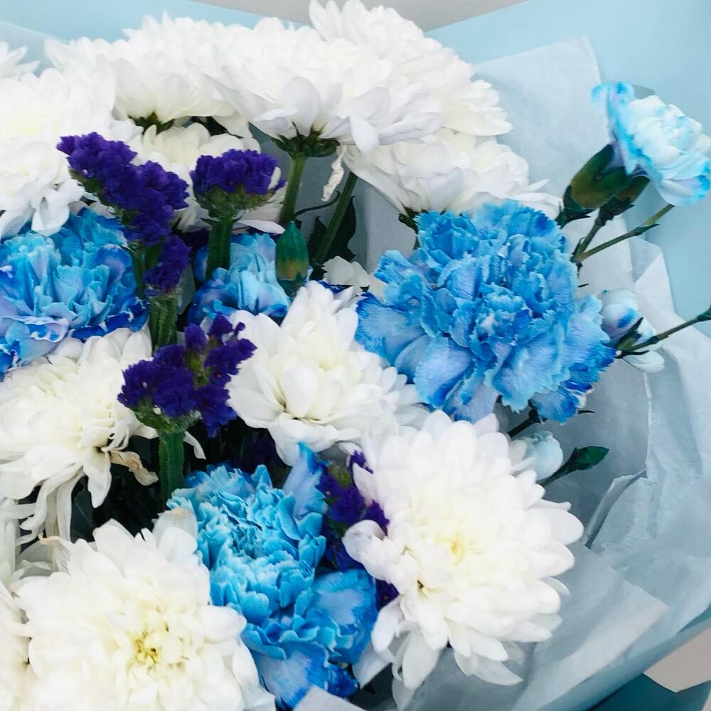 Хризантема кустовая – 3 шт.Диантус – 3 шт.Диантус кустовой – 3 шт.Статица – 1 шт.Тишью – 1 шт.Пленка матовая – 1 шт.Лента атласная – 1 шт.