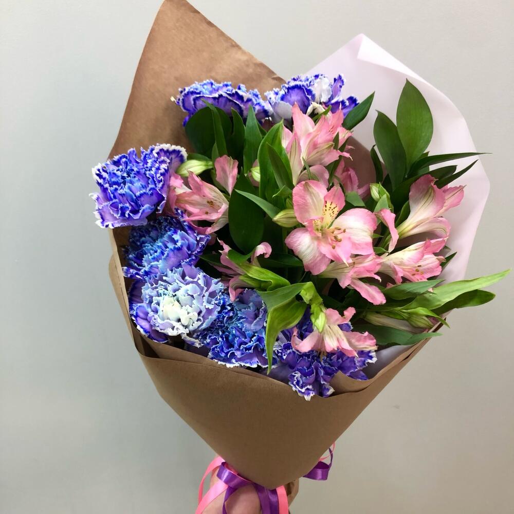 Диантус – 7 шт.Альстромерия – 3 шт.Рускус – 3 шт.крафт однотонный – 1 шт.Лента атласная – 2 шт.