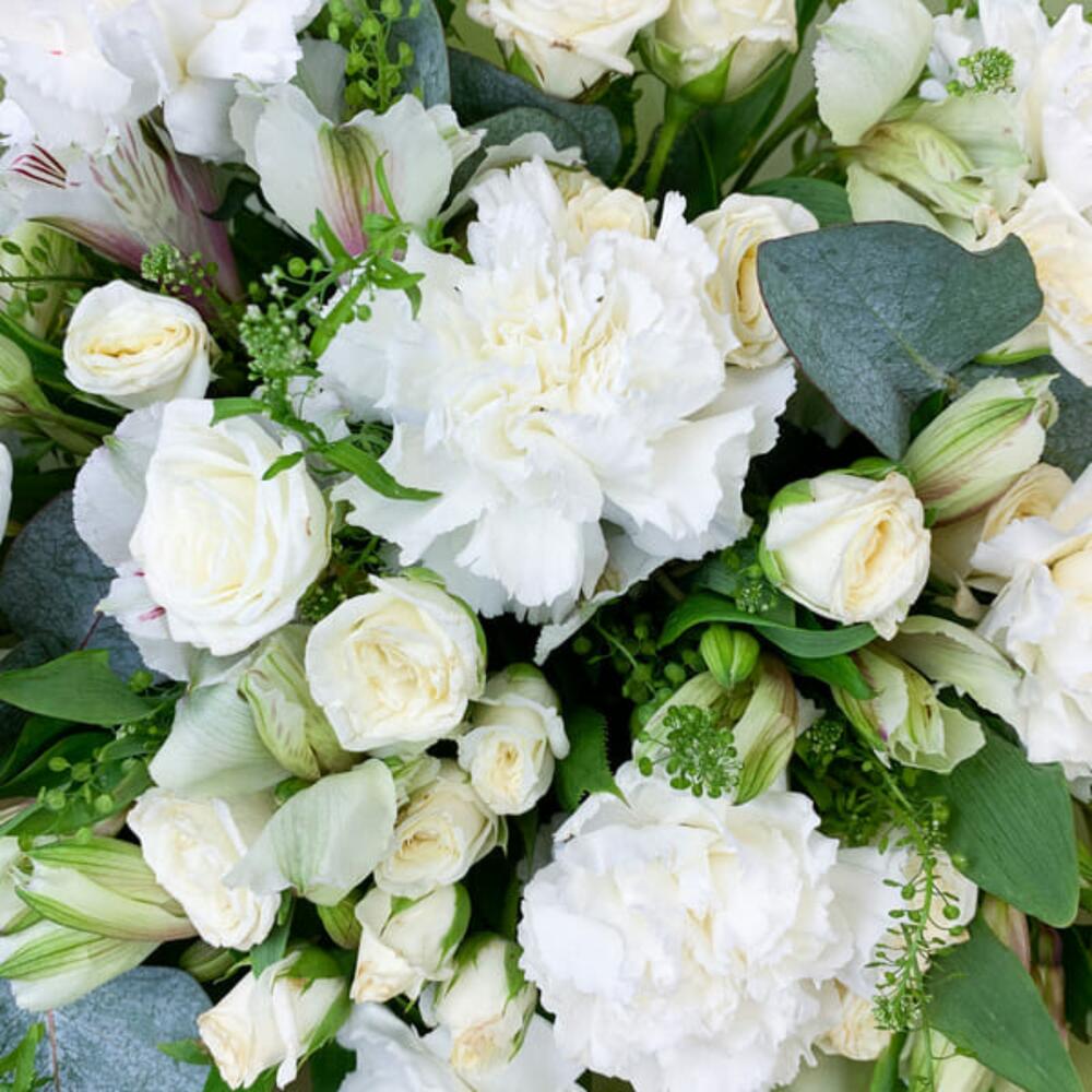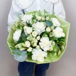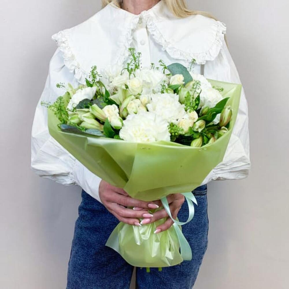 Букет из альстромерии, кустовой розы и диантуса в белых тонах