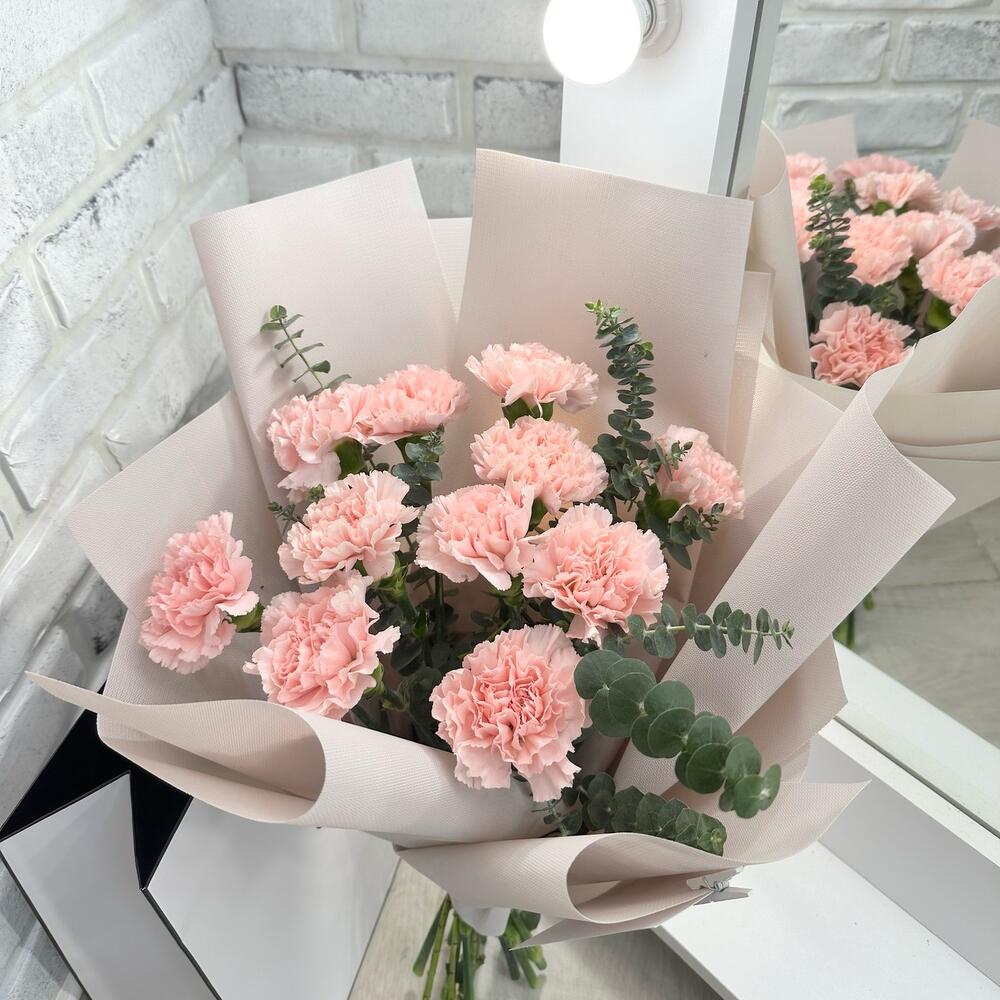 Эвкалипт – 1 шт.Лента атласная – 1 шт.Диантус сортовой – 13 шт.подкормка для срезанных цветов – 1 шт.инструкция по уходу за цветами – 1 шт.упаковка зефирка – 3 шт.