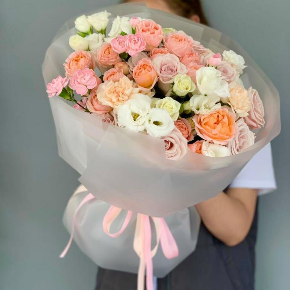 Гвоздики, Лизиантусы, Розы, Тюльпаны