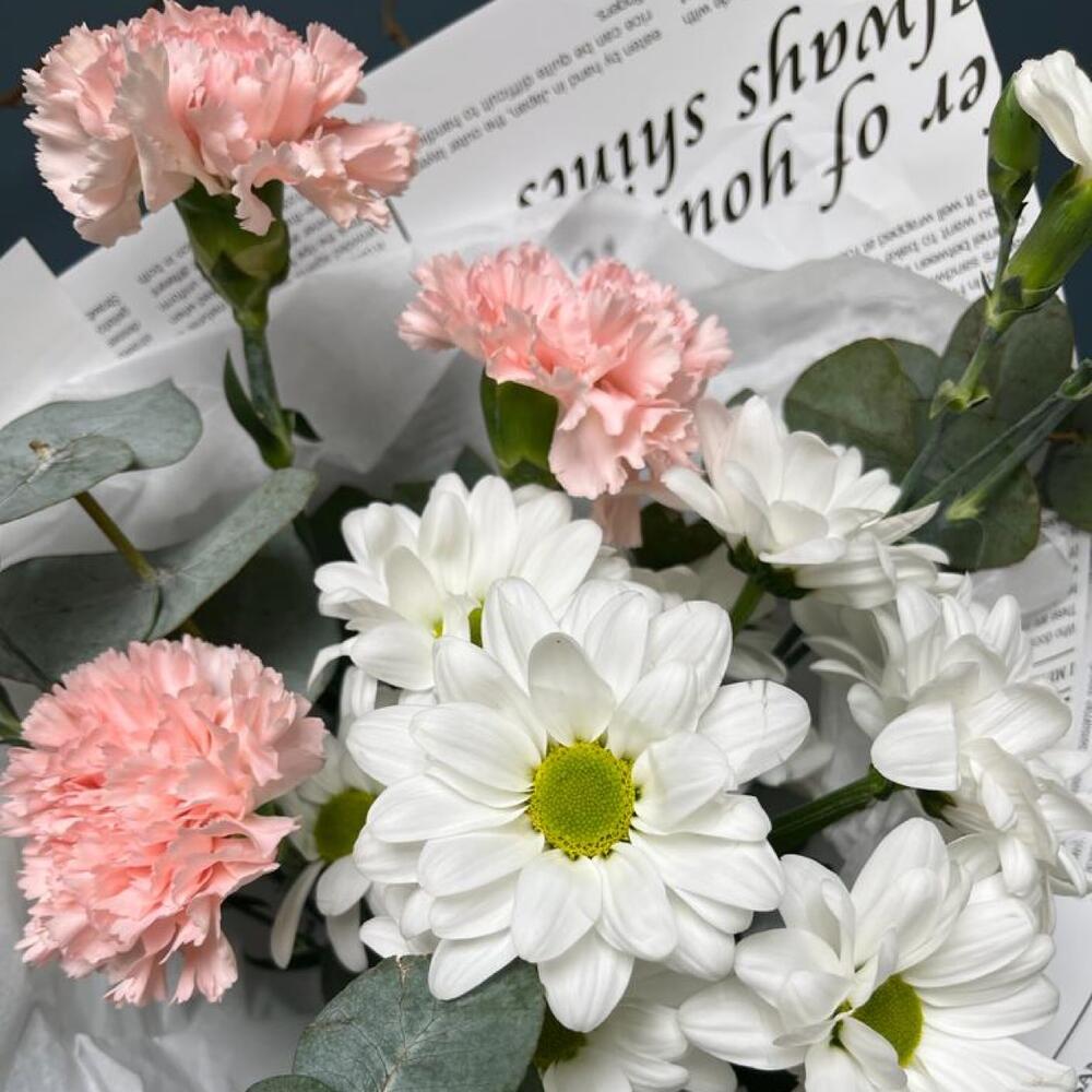 Букет «Нежность» с кустовыми гвоздиками, кустовой хризантемой и гвоздиками