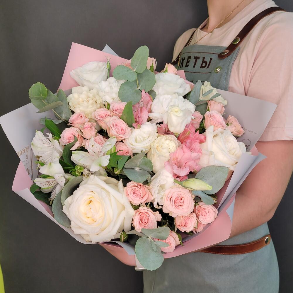 роза канделайт – 3 шт.Роза Мондиаль – 2 шт.Диантус – 4 шт.Альстромерия – 4 шт.Роза кустовая – 3 шт.эвкалипт ветка большая – 2 шт.Упаковка дизайнерская – 2 шт.