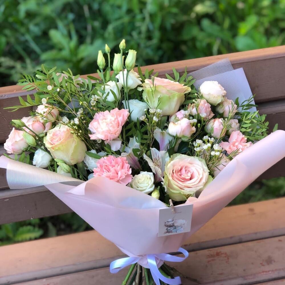 Роза розовая – 3 шт.Гвоздика розовая – 3 шт.Роза кустовая розовая – 2 шт.Альстромерия белая – 1 шт.эустома белая – 1 шт.Ваксфлауэр – 1 шт.фисташка зелень – 2 шт.открытка мини микс – 1 шт.