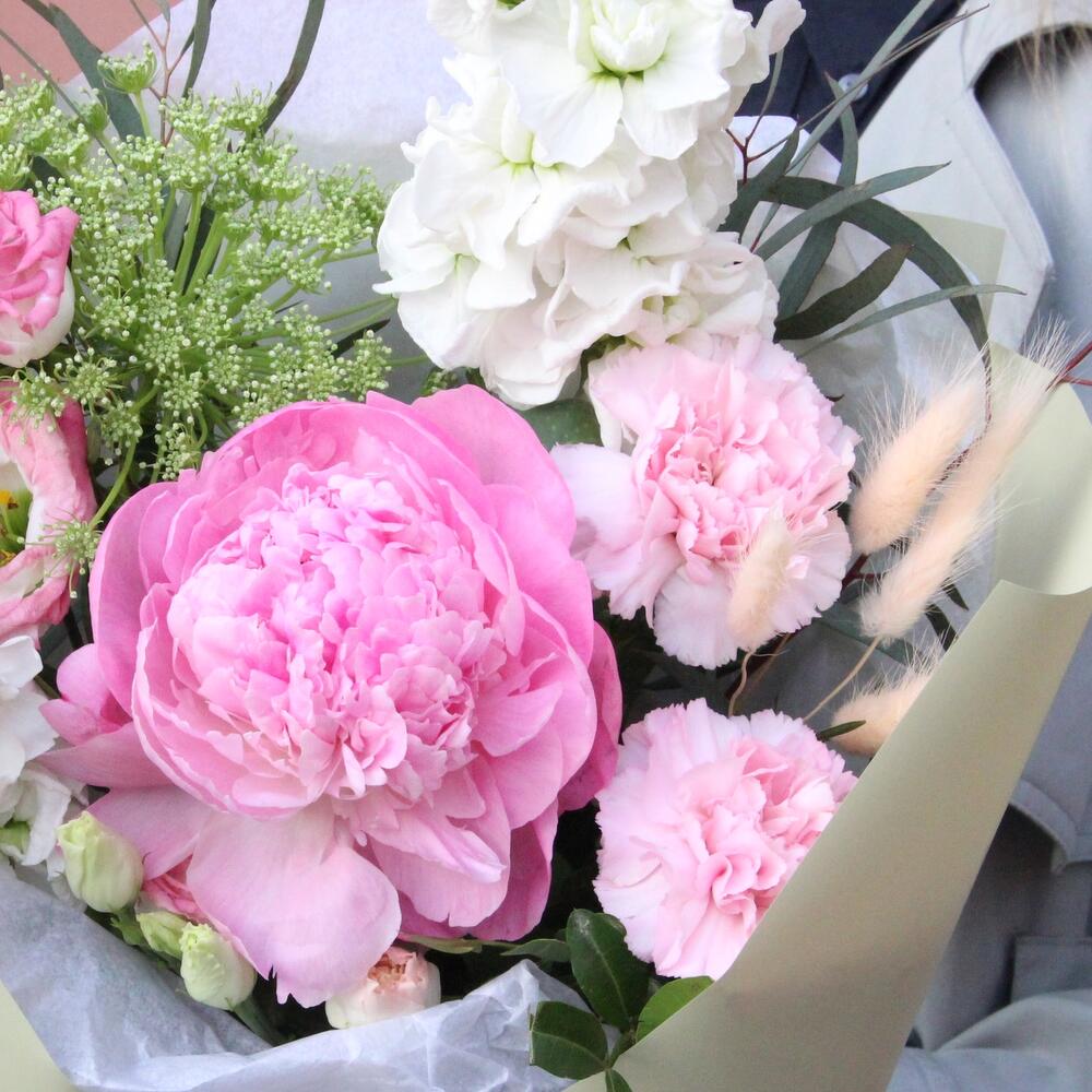 Пион – 1 шт.Лизиантус – 1 шт.Маттиола – 2 шт.Амми – 1 шт.Гвоздика – 1 шт.Лагурус – 5 шт.Эвкалипт – 2 шт.Упаковка дизайнерская – 1 шт.Лента атласная – 1 шт.
