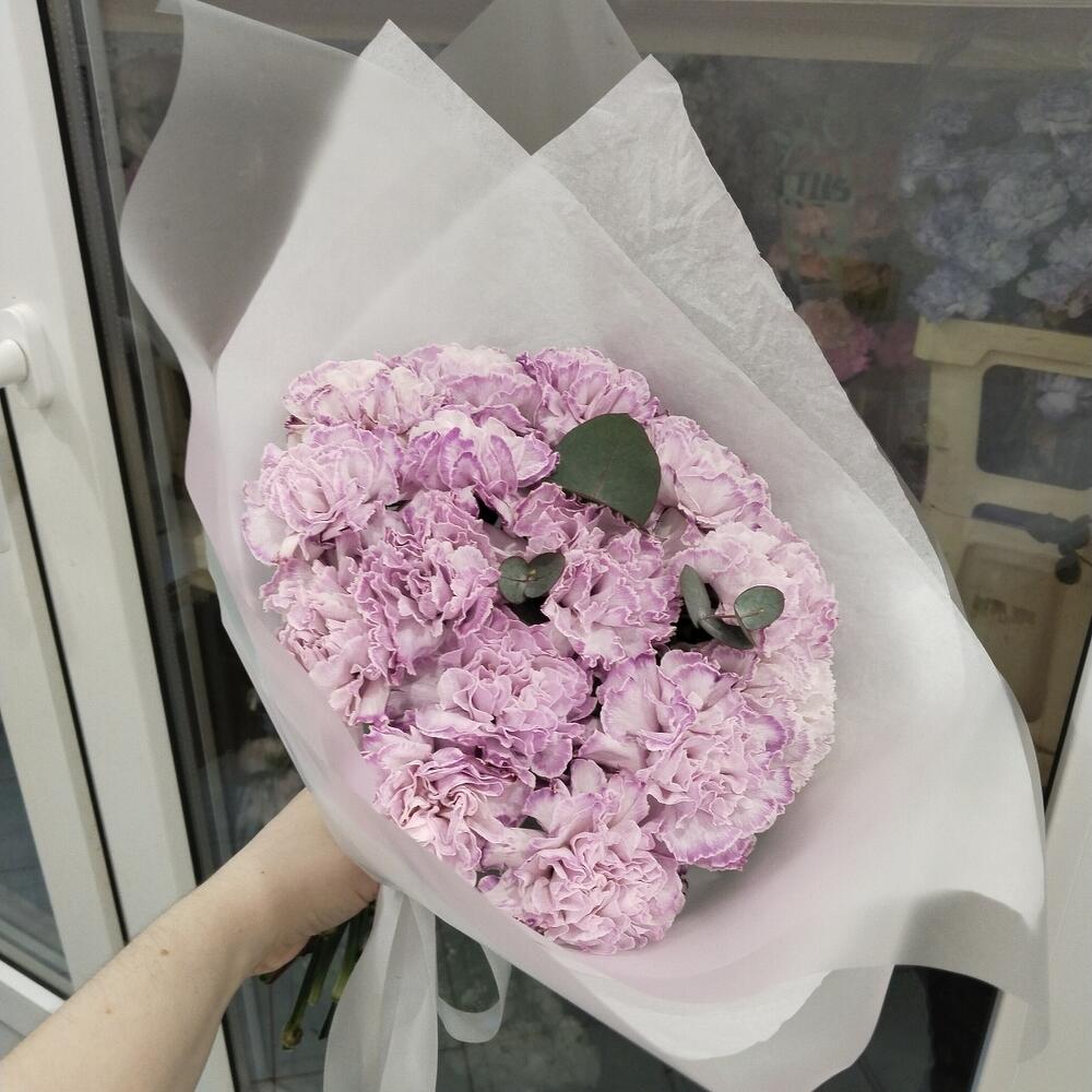 Букет из крашеной гвоздики с добавлением веточек эвкалипта в лаконичной матовой упаковке