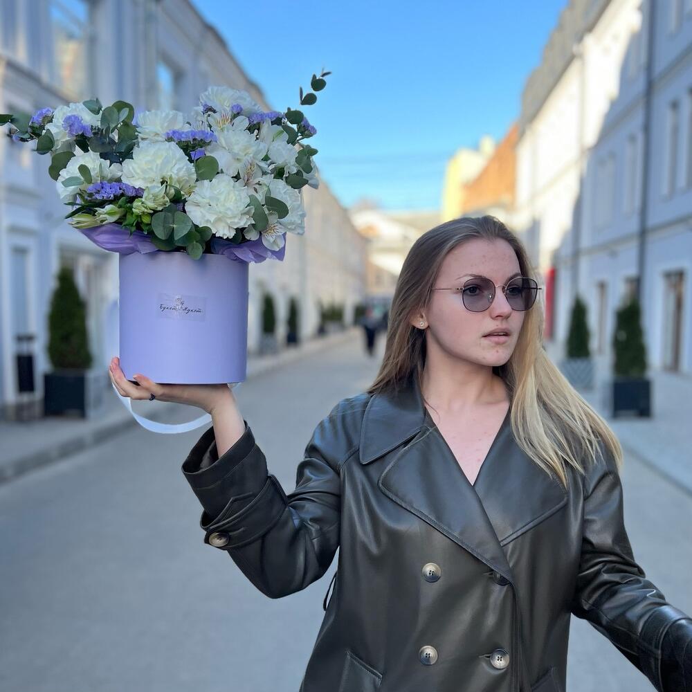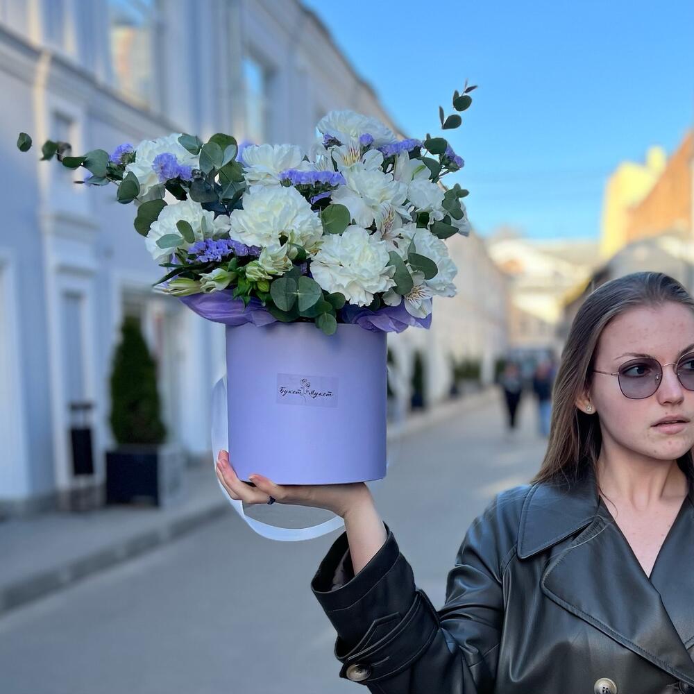 Альстромерия – 2 шт.Статица – 2 шт.Эвкалипт – 1 шт.Тишью – 1 шт.Диантус – 9 шт.Коробка шляпная – 1 шт.Оазис флористический – 1 шт.