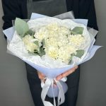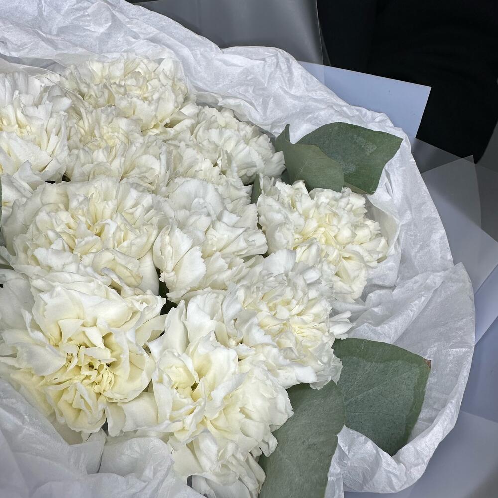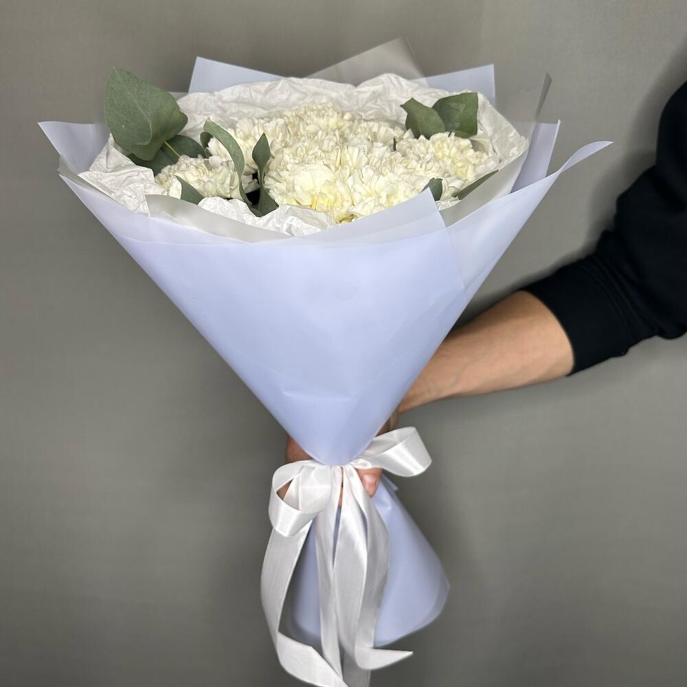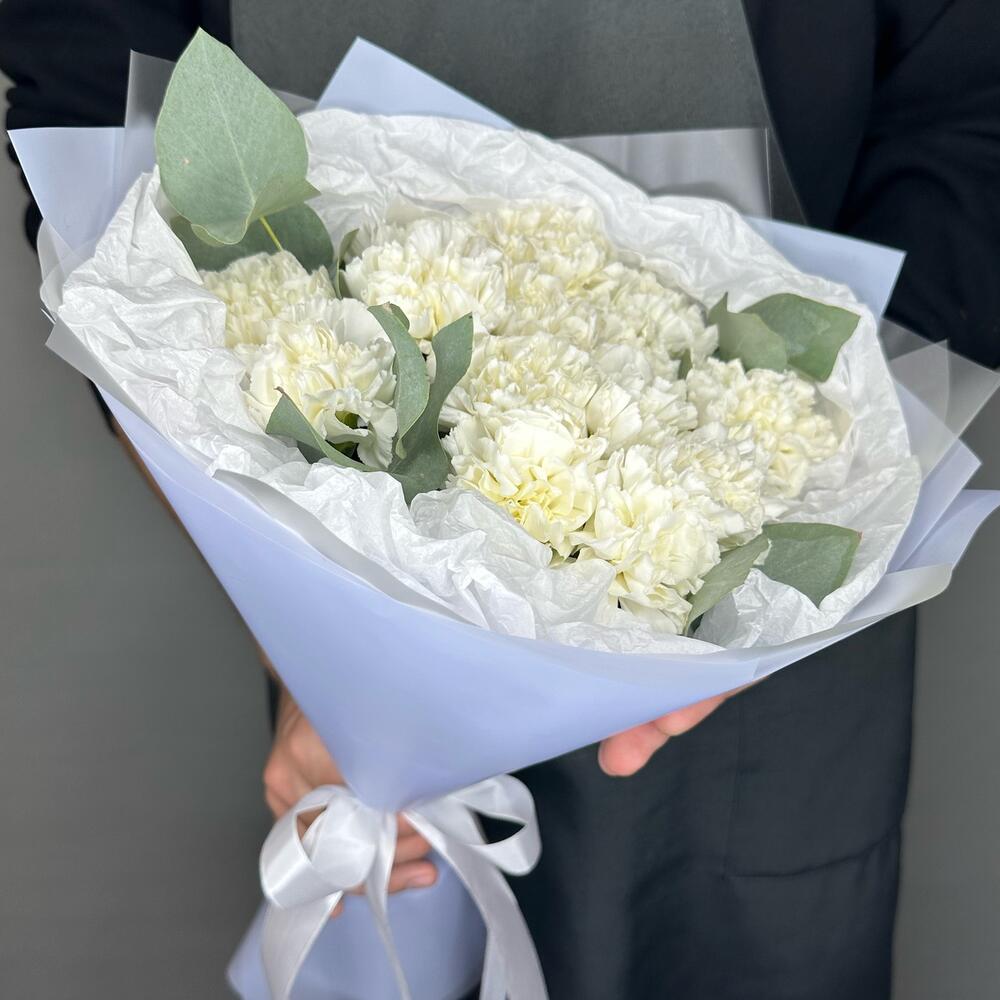 Монобукет из 15 белоснежных диантусов и ароматного эвкалипта “Океанический бриз”