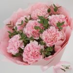 Нежный и стойкий букет из сортовых розовых динтусов и эвкалипта в стильной упаковке в тон. Такой букет всегда уместен и подойдёт для любого повода: День Рождения, именины, годовщина свадьбы, рождение ребенка, 8 марта, День Святого Валентина, выпускной и т.д. Можно вручить маме, сестре, подруге, коллеге, учителю, любимой.