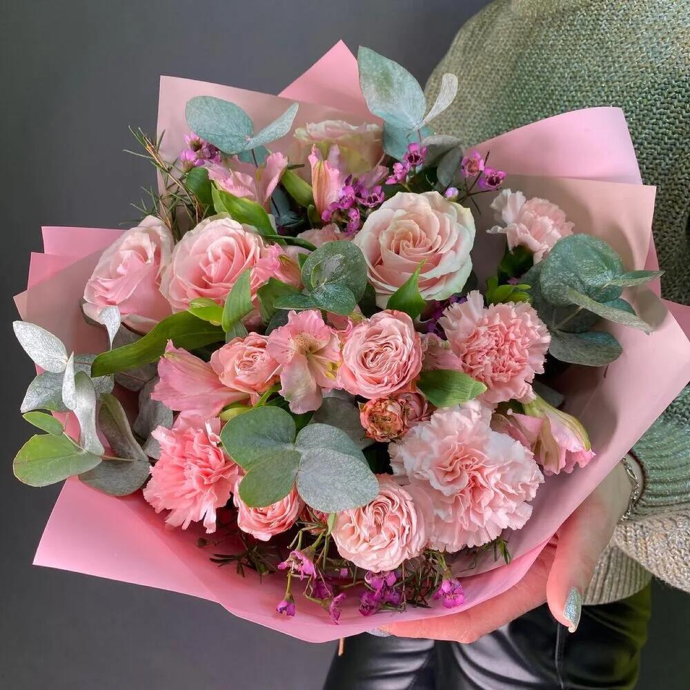 Букет из розовых гвоздик, пионовидных роз, эустом