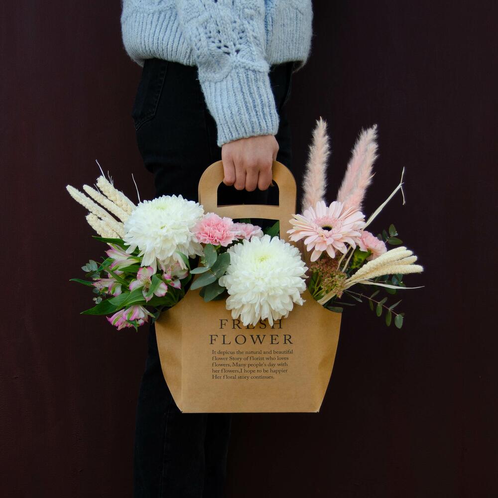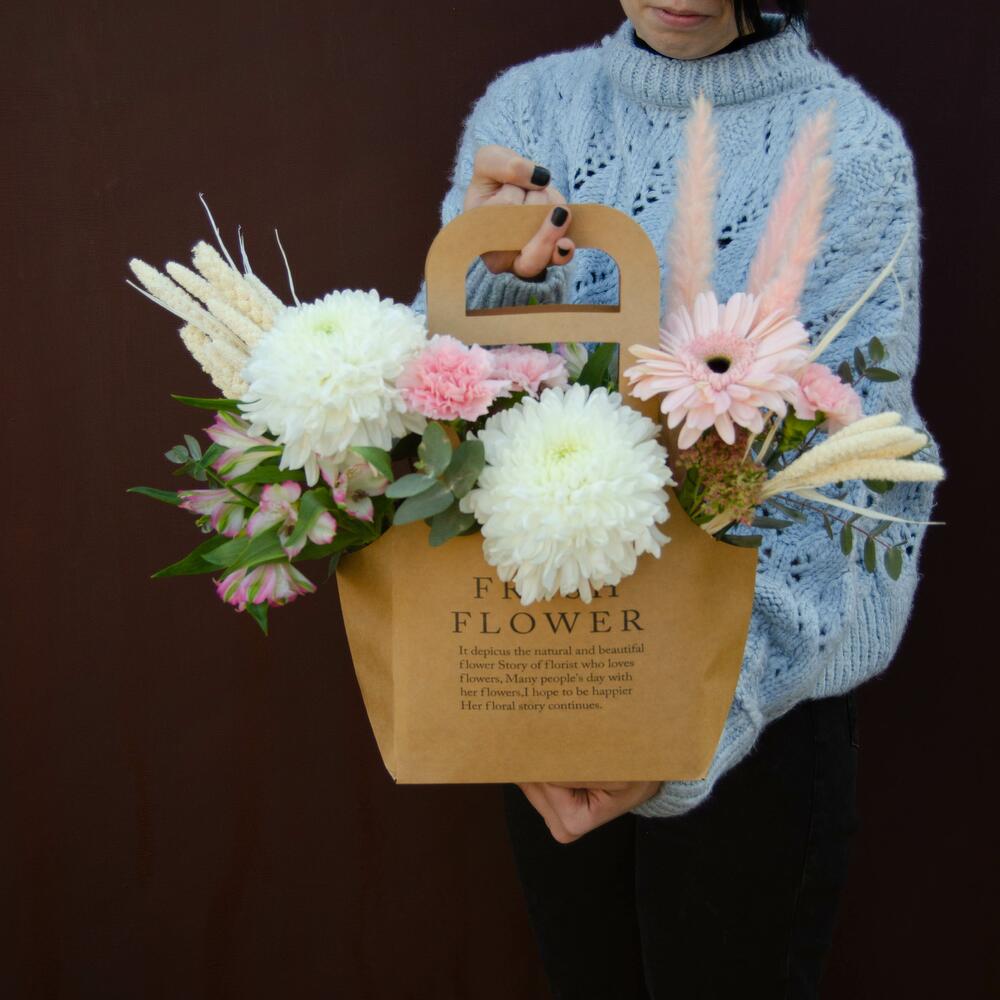 Сумка – 1 шт. Оазис – 1 шт. Альстромерия – 2 шт. Гвоздика – 3 шт. Хризантема – 1 шт. Скиммия – 1 шт. Гербера – 2 шт. Фисташка – 2 шт.