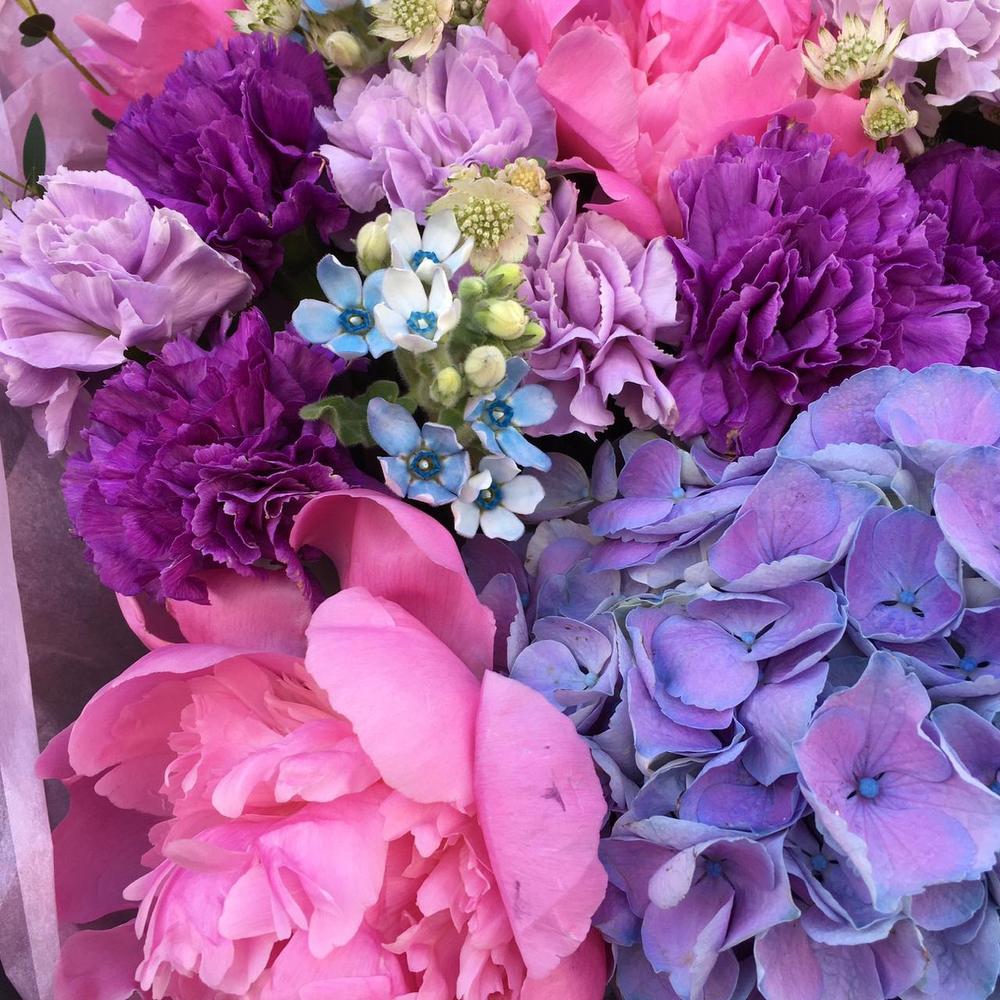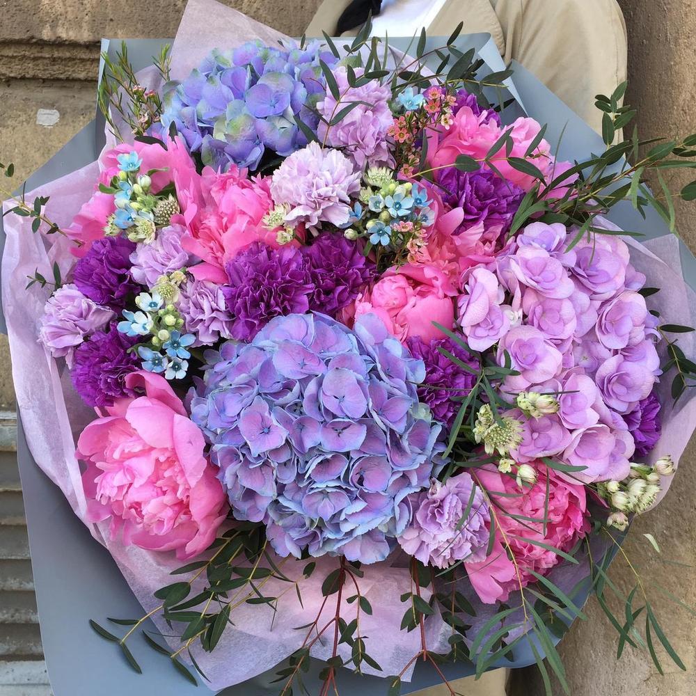 Гортензия – 3 шт.Пион – 7 шт.Эвкалипт – 8 шт.Гвоздика – 9 шт.Лента атласная – 2 шт.Тишью – 4 шт.Упаковка дизайнерская – 5 шт.Астранция – 4 шт.Твидия – 6 шт.