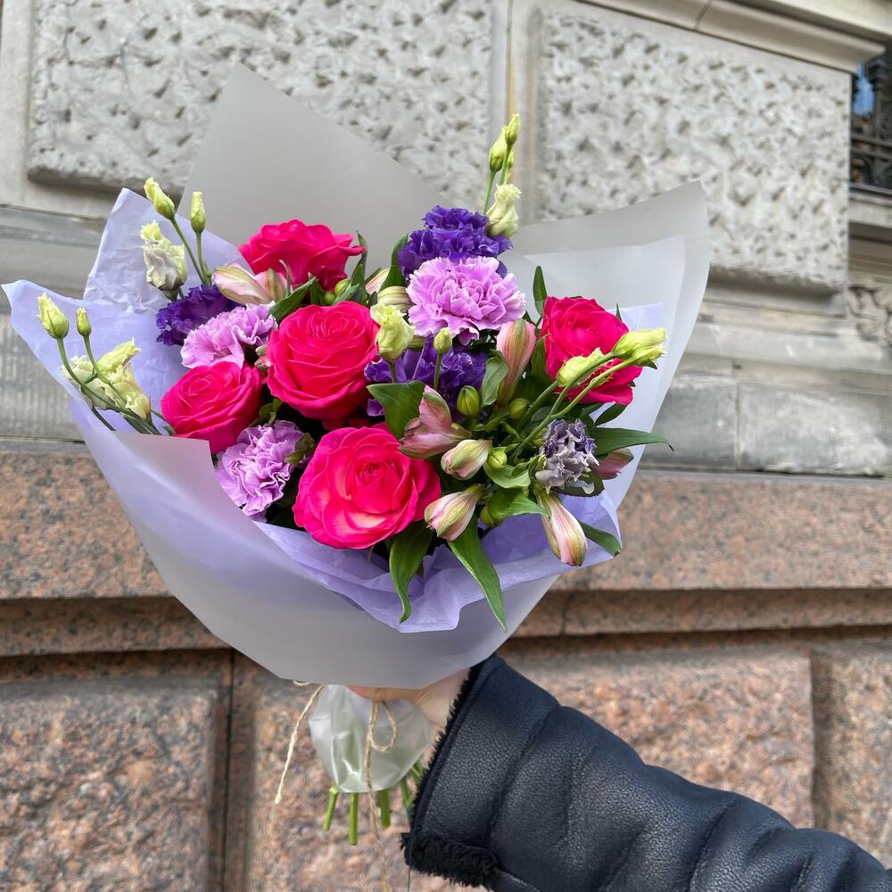 Альстромерия – 2 шт.Лизиантус – 2 шт.Гвоздика – 3 шт.Фисташка – 4 шт.Упаковка дизайнерская – 3 шт.Роза розовая 50 см – 5 шт.