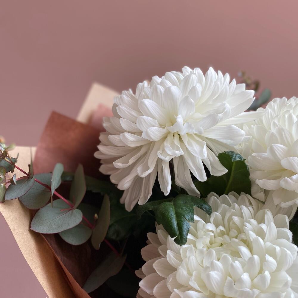 Эвкалипт – 2 шт.Лента атласная – 1 шт.Тишью – 2 шт.Крафт – 2 шт.Хризантема Антонов – 3 шт.