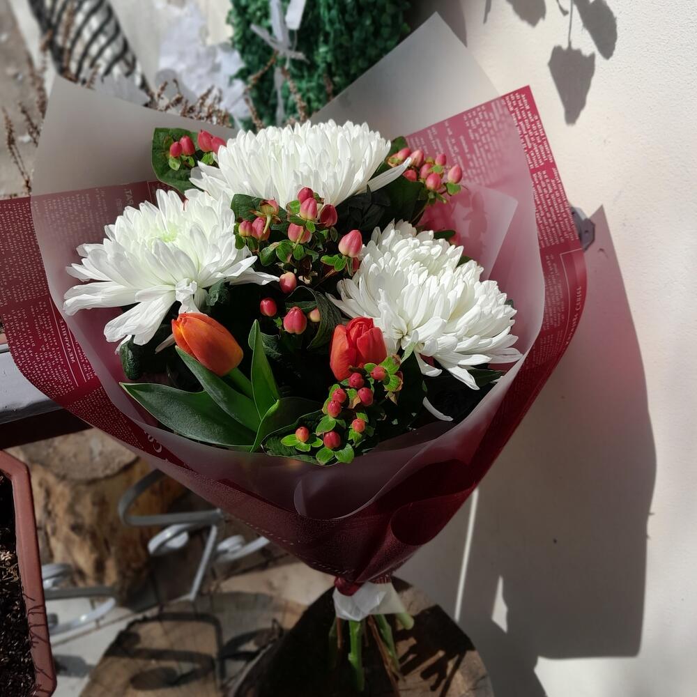 Тюльпан – 2 шт.Лента атласная – 2 шт.Фисташка – 2 шт.Хиперикум – 4 шт.Упаковка дизайнерская – 2 шт.Хризантема Антонов – 3 шт.