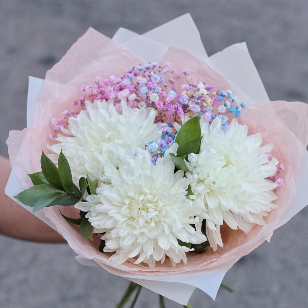 Букет из трёх хризантем и цветной гипсофилы с зеленью