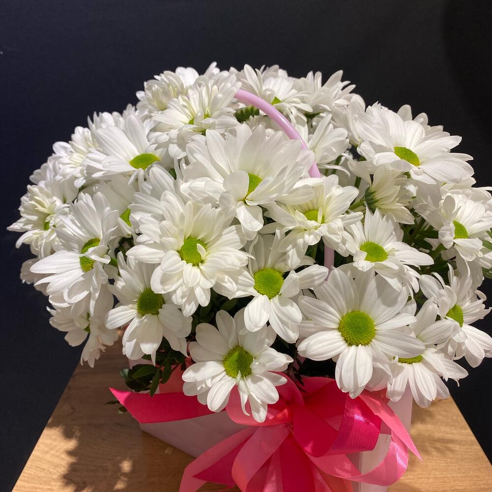 Сумочка – 1 шт. Оазис флористический – 1 шт. писташка зелень – 2 шт. хризантемы кустовые – 6 шт. Слюда упаковка – 2 шт. Лента атласная – 2 шт.