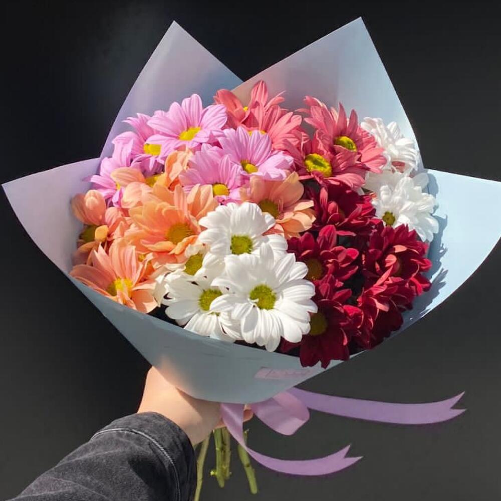 Хризантема кустовая – 7 шт. Упаковка дизайнерская – 2 шт. Открыточка с вашими пожеланиями – 1 шт.