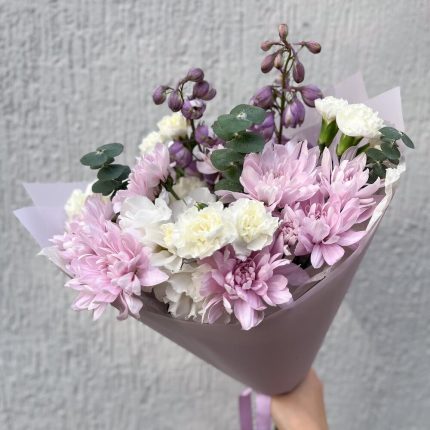 Хризантема кустовая – 5 шт. хризантема бигуди – 5 шт. Статица – 2 шт. левкадендрон – 3 шт.