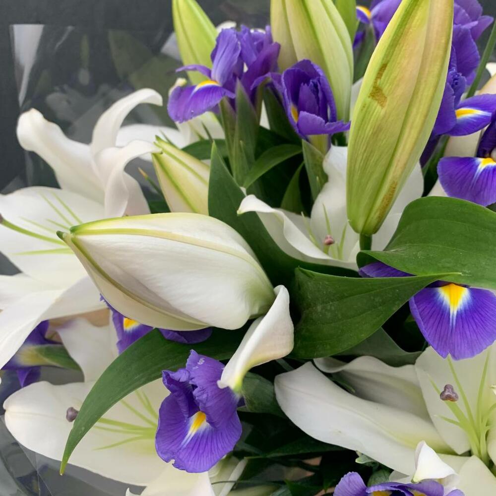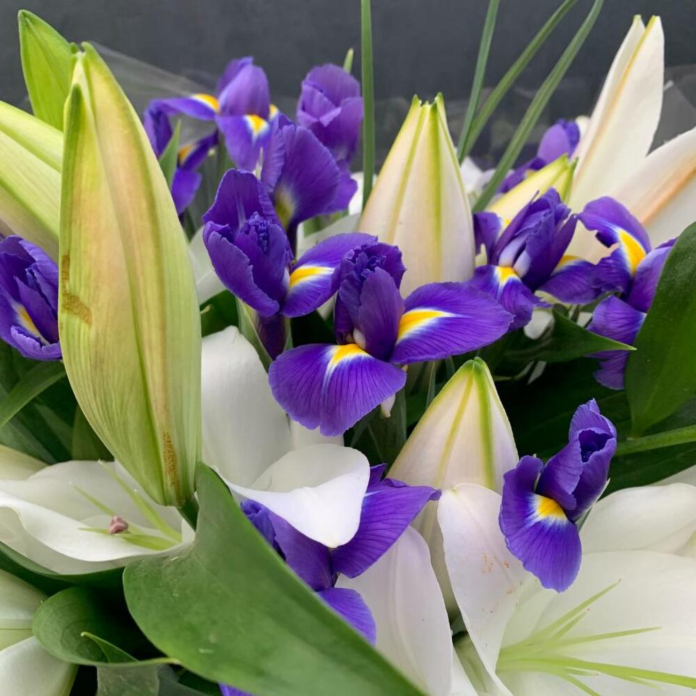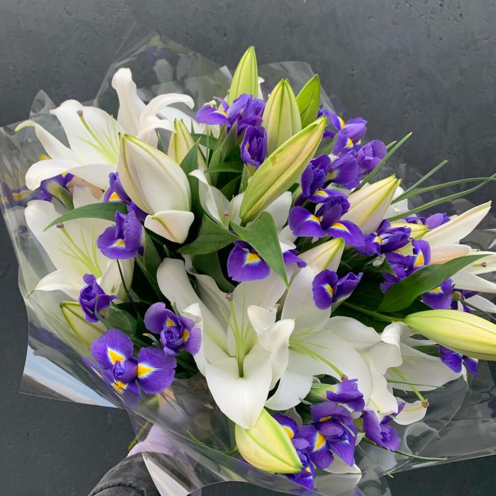 Лилия белая – 7 шт.Ирис – 26 шт.Фисташка – 10 шт.Упаковка дизайнерская – 2 шт.Лента – 1 шт.