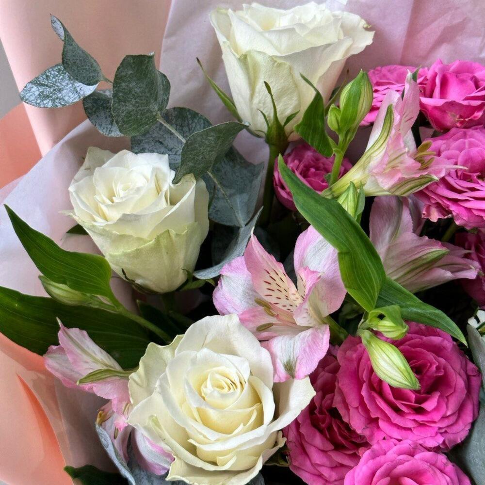 Букет роз , альстромерий и эвкалипта в дизайнерской упаковке