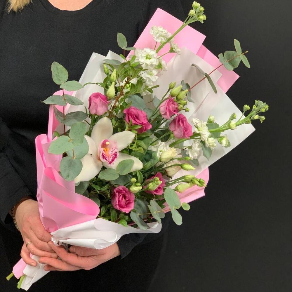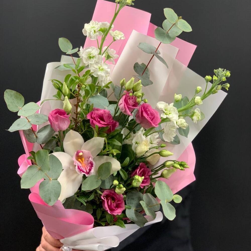 Орхидея Цимбидиум – 1 шт.Маттиола – 2 шт.Лизиантус – 2 шт.Фисташка – 3 шт.Эвкалипт – 2 шт.Упаковка дизайнерская – 1 шт.