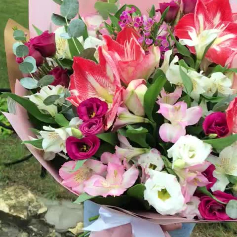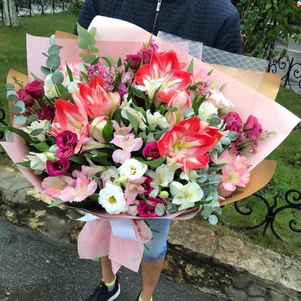 Альстромерия – 10 шт.Амариллис – 3 шт.Ваксфлауэр – 2 шт.Лизиантус – 8 шт.Эвкалипт – 5 шт.Зелень – 5 шт.Лента атласная – 1 шт.Упаковка дизайнерская – 3 шт.