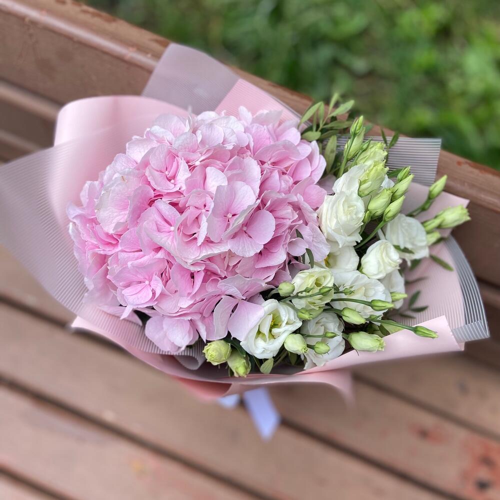 Гортензия розовая – 1 шт.эустома белая – 2 шт.фисташка зелень – 2 шт.